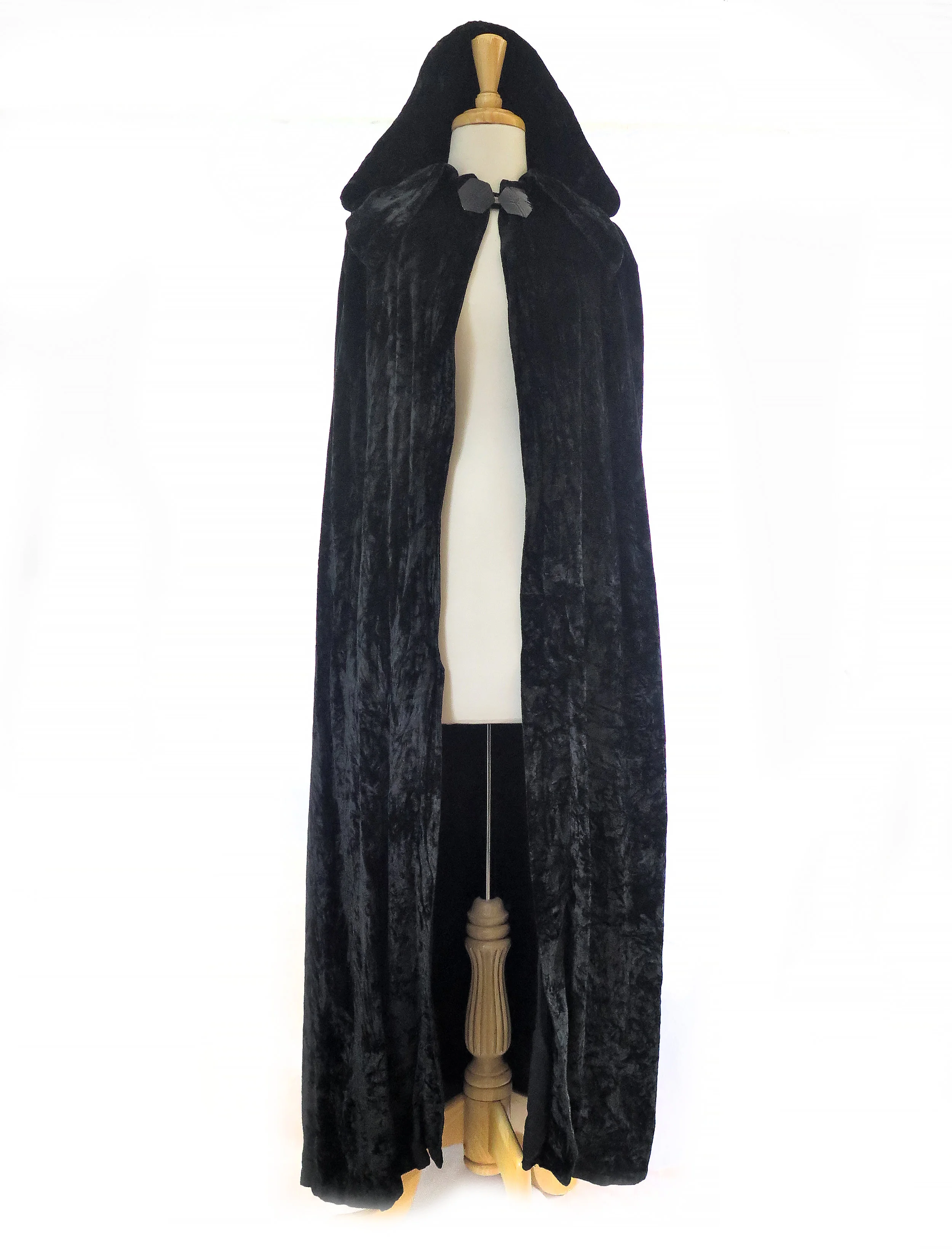 Full length black crushed silk velvet cloak with hood and collar. Buttoned in the front with two art deco hexagonal feature buttons.