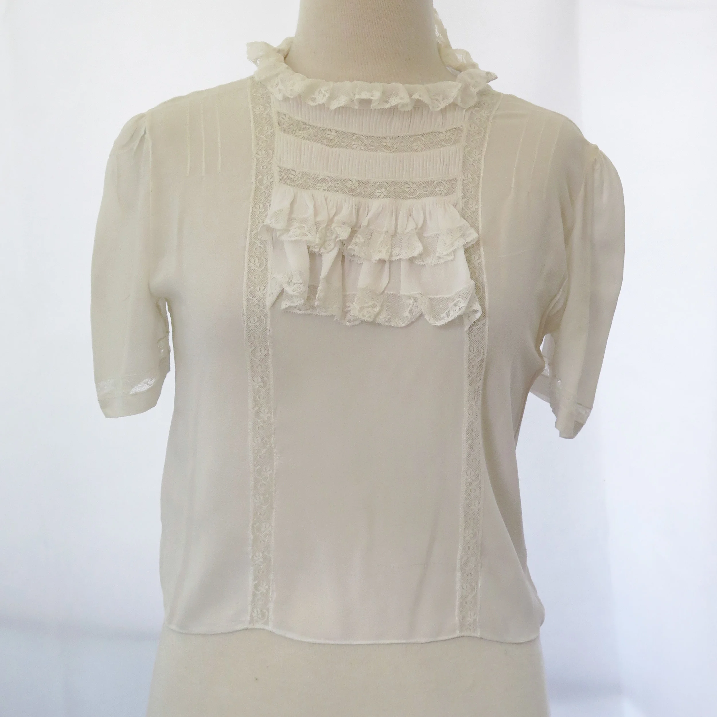 Beautiful white silk crepe blouse with frill collar, fine lace panels and ruffles.